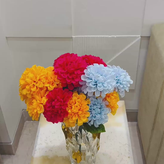 Vibrant artificial dahlia flower stems in stunning shades of pink, yellow, and blue. Perfect for adding a pop of color to any space, these lifelike blooms offer lasting beauty without the maintenance. Ideal for home decor, events, or gifting!