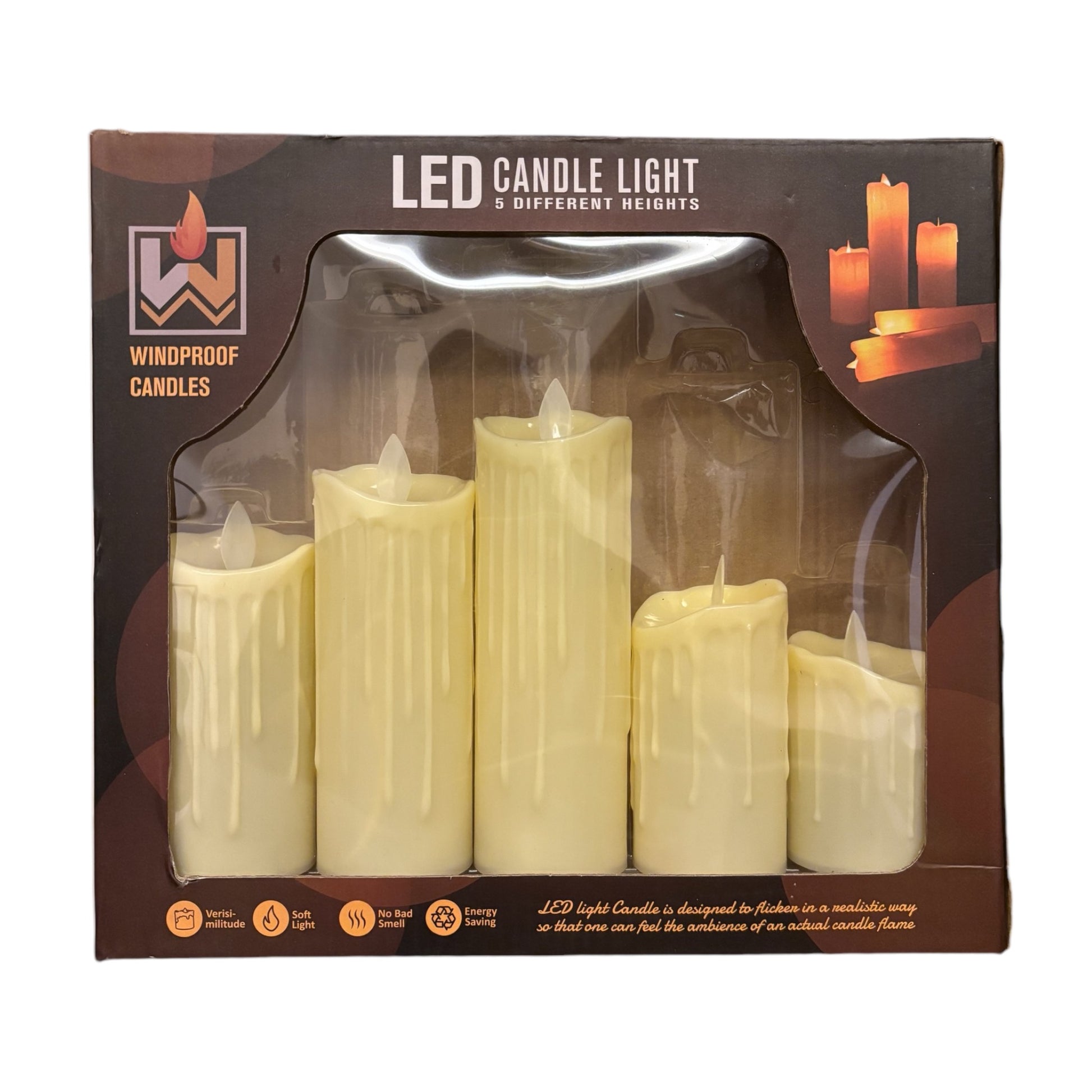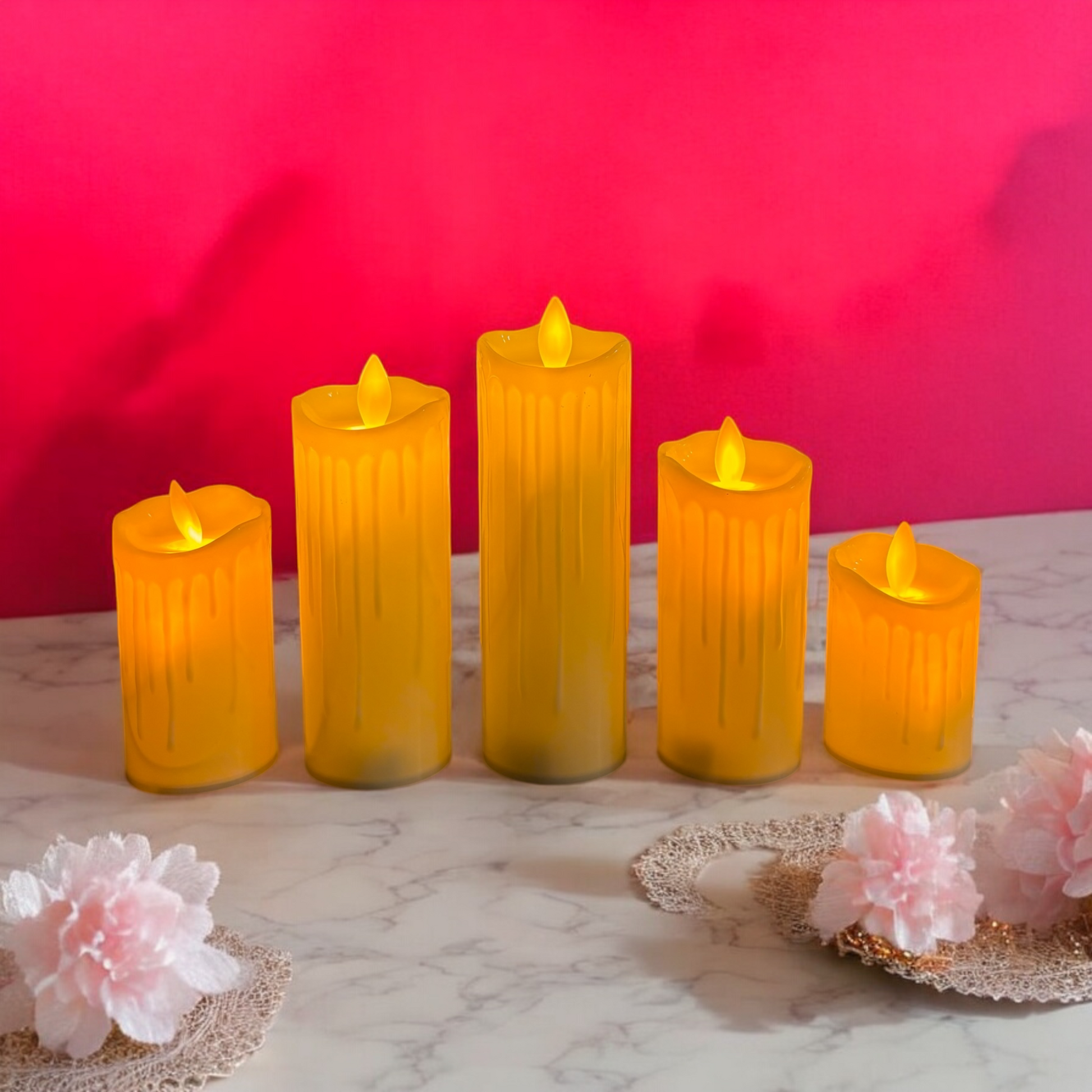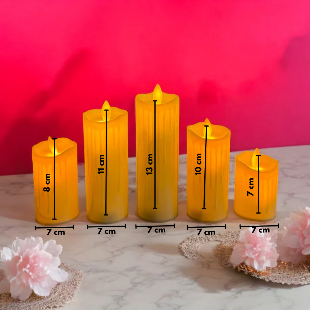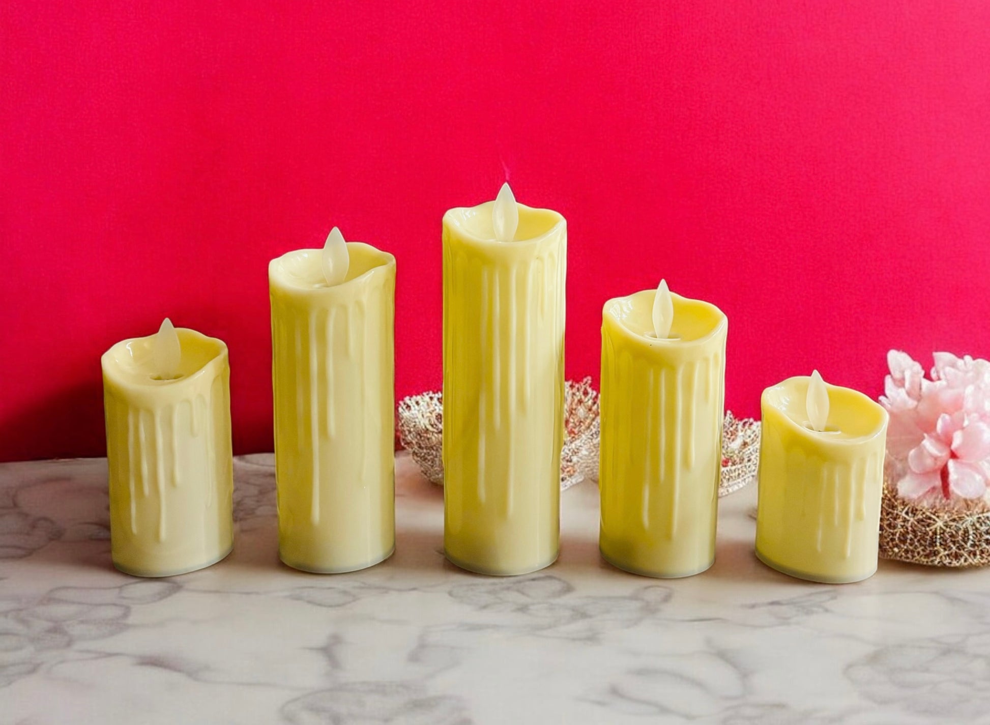 The Artificial Melted Flickering Candles set of 5 features realistic, wax-like textures and a warm, flickering glow that mimics real flames. Each candle varies in height for a dynamic display, making them perfect for creating a cozy atmosphere without the worry of open flames. Ideal for home decor, events, or special occasions, these candles are battery-operated and safe for any setting.
