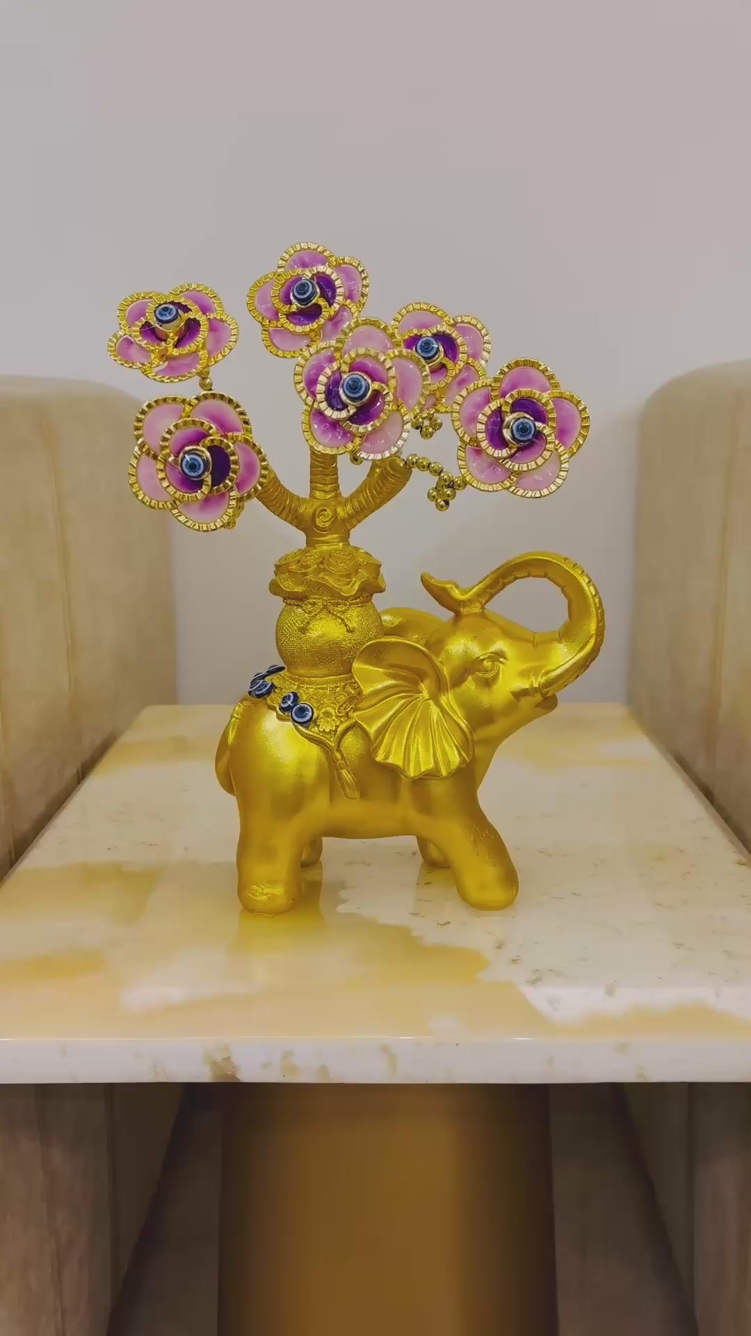 Enhance your space with this stunning Golden Elephant adorned with a vibrant Evil Eye Flower Tree. Crafted with intricate detail, this decorative piece symbolizes prosperity, protection, and good fortune. The combination of golden hues, eye-catching flowers, and the powerful evil eye charm makes it a perfect addition to your home or office. Ideal for attracting positive energy and warding off negativity.