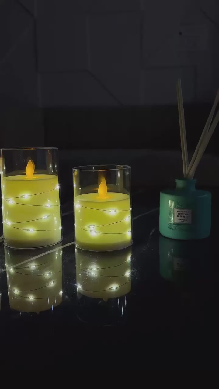 Enhance your home’s ambiance with this elegant set of 3 LED flameless candles, each encased in a sleek glass holder. Wrapped in delicate string lights, these artificial candles provide a warm, realistic glow without the worry of flames. Perfect for creating a cozy and inviting atmosphere, these flameless candles are ideal for any space, whether it's for special occasions, dinner parties, or simply to add a touch of charm to your living room. Safe, stylish, and hassle-free, this candle set is a must-have for modern home décor.